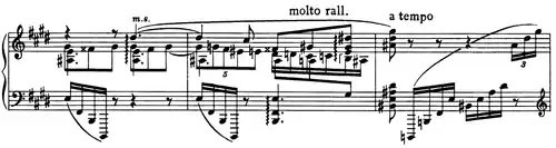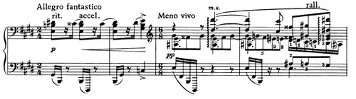 | 3 | 227–270 | The next section features materials derived from the coda and the introduction. First, the presto tumultuoso esaltato is developed. The trills theme is briefly quoted(mm. 247–250). Then, the languido theme is mocked (mm. 251ff.). | ||