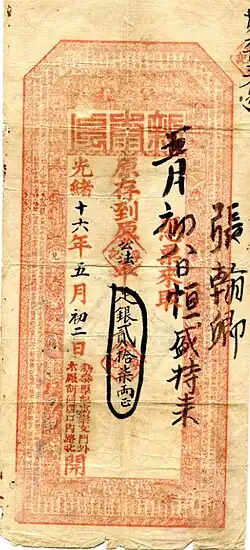A banknote issued by a piaohao in the year Guangxu 16 (1890).