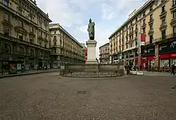 Piazza Cordusio (also informally referred to as Piazzale Cordusio)[1] is a square in central Milan, Italy. The piazza takes its name from the Cors Ducis (Ducal court) which was located on the square during Longobard times. It is well known for its several turn-of-the-19th-century Neoclassical, eclectic and Art Nouveau buildings, banks and post offices. Even though many of these have now relocated elsewhere, it is still an important commercial square in the city and hosts the Palazzo delle Assicurazioni Generali (Palace of the Assicurazioni Generali), the Palazzo del Credito Italiano (Palace of the Credito Italiano) and the Palazzo delle Poste (Palace of the Post Office), former Borsa di Milano (former Milan Stock Exchange). Piazzale Cordusio hosts the Cordusio metro station and is the starting point of the elegant pedestrian Via Dante which leads to the imposing medieval Castello Sforzesco, or Milan Castle. Opposite to Via Dante, Cordusio borders onto Piazza Mercanti, former city centre in the Middle Ages, which leads directly to Piazza del Duomo, today's city centre.