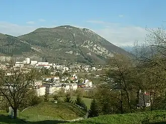 The mountain is accessible by funicular, which has been in operation since 1900. It transports passengers up to 950 m high, which follows a 1,100 m (3,600 ft) long route, on a slope varying from 27% (right at the beginning) to 56%.[1] The route separates in two in the middle to enable the two trains to pass. It travels through two tunnels and over a viaduct, which can be seen from distance, such as from the route linking Lourdes to Argelès (Argelès-Lourdes direction). The lower station is accessible near the route (indicated by arrows from the southern Lourdes exit roundabout). One can also get to it by bus from the town-centre.