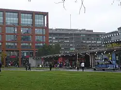 A new seven-storey office building designed by Allies and Morrison, One Piccadilly Gardens, was erected on the eastern side of the gardens, reducing the size of the gardens by 11%. Its construction helped to fund the gardens redevelopment scheme.[23]