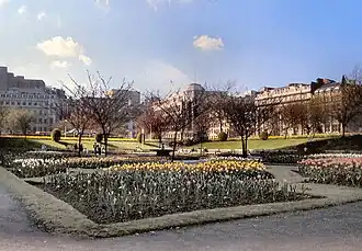 Following the demolition of the hospital, the use of the empty site was uncertain for some years. There was a proposal to erect a new municipal art gallery on the site, and plans were drawn up by the architect Ernest Berry Webber for a large Neoclassical building.[12] However, this scheme was never realised and the city's fine art collection remained in the Manchester City Art Gallery on nearby Mosley Street. Another scheme put forward by the architect Richard Carpenter was to build a large new replacement for Manchester Cathedral on the site. In 1917, the conductor Thomas Beecham proposed the construction of a large opera house, but he went bankrupt before he could advance this plan any further. The "Great Hole of Piccadilly" remained empty throughout the 1910s and 1920s. In the 1930s, it was finally decided not to erect a new building on the former hospital site, but to turn it into a public garden. The area was landscaped and a sunken garden was laid out on the footprint of the former hospital basement, with formal flower beds, a rose garden and flowering cherry trees.[13][8]