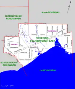 The district consisted of the southwest part of the city of Pickering and the southeast part of the Scarborough district of Toronto. It was the only riding to overlap the boundaries of the 416 (City of Toronto) and the 905 (Greater Toronto Area) regions.