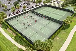 The world's first dedicated pickleball stadium was established at The Fort pickleball center, in Fort Lauderdale, Florida, by Brad Tuckman and Rich Campillo.[28] The facility, located in the 93-acre (38 ha) Snyder Park, includes 43 pickleball courts, a 4,000-square-foot (370 m2) event center, a restaurant, and several other sporting and entertainment venues. It is also the permanent home and training facility for the Association of Pickleball Players.[29]