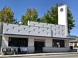 At Piedmont Avenue and 41st Street are the Key Route Plaza and what is left of the Key System's C-line station, which was built in 1939. The former station is an angular building with a clock tower, which was restored by a group led by neighborhood activist Michael Lydon.[12] In 2005, with support from the Piedmont Avenue Neighborhood Improvement League, Rocky Riche-Baird painted a mural recognizing the building's history, including the Key System's founder, Francis Marion Smith.[13] However, a large part of the mural was controversially destroyed during renovations in 2014.[14][15]