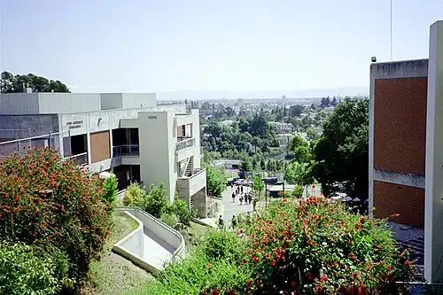 Much of the school is made of concrete with fake brick layers. Only a few buildings — such as the science and P.E. buildings — are completely indoors. The main building has open hallways. Most hallways and many classroom have views of the Bay.