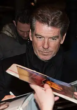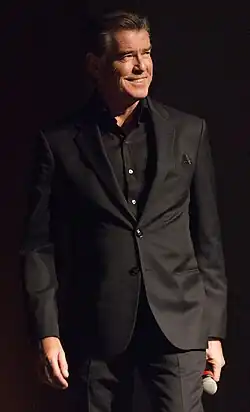 Brosnan has received two Golden Globe Award nominations, for the miniseries Nancy Astor (1982) and for the dark comedy film The Matador (2005). In 1996, he and the American film producer Beau St. Clair founded the Los Angeles–based production company Irish DreamTime.[2] He is also known for his charitable work and environmental activism. In 1997, Brosnan received a star on the Hollywood Walk of Fame for his contributions to the film industry.[3] In 2020, he was listed at No. 15 on The Irish Times' list of the greatest Irish film actors.[4]