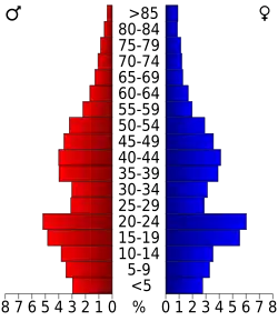 In the county, the population was spread out, with 24.40% under the age of 18, 17.00% from 18 to 24, 28.10% from 25 to 44, 20.80% from 45 to 64, and 9.60% who were 65 years of age or older. The median age was 32 years. For every 100 females there were 97.30 males. For every 100 females age 18 and over, there were 94.20 males.