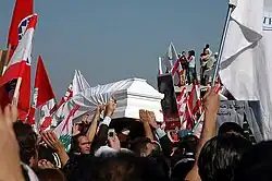 A funeral ceremony for him was held on Martyrs' Square on 23 November 2006 with the participation of hundreds of thousands of supporters of the 14 March Alliance, and turned to be a political character.[11] In Martyrs' Square, 800,000 men, women, and children gathered, waving Lebanese flags in red, white, and green, alongside posters of Pierre Gemayel.[25] His body was buried in his hometown Bikfaya after Patriarch Nasrallah Sfeir performed the rites in Beirut.[1][26]