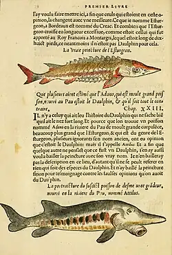 - 1551: L'histoire naturelle des estranges poissons marins, avec la vraie peincture & description du Daulphin, & de plusieurs autres de son espece. Observee par Pierre Belon du Mans. A Paris. 1551.