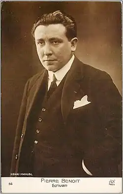Pierre Benoit, born in Albi (southern France) was the son of a French soldier. Benoit spent his early years and military service in Northern Africa, before becoming a civil servant and librarian.[2] In 1914 he published his first book of poems. He then joined the French army and after the Battle of Charleroi was hospitalised and demobilised.