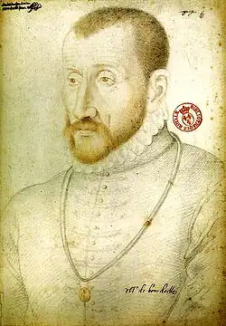 Born at Bourdeilles in the Périgord, Brantôme was the third son of the baron François de Bourdeille and Anne de Vivonne. His mother and maternal grandmother, Louise de Daillon du Lude, were both attached to the court of Marguerite of Navarre. After Marguerite's death (1549), Brantôme went to Paris and later to Poitiers (1555) to finish his education.[1] He was a nephew of Jeanne de Dampierre, who belonged to the royal household and whom he cited as a source of information in his works.[2]
