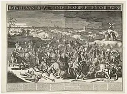 ![]() Battle of Lekkerbeetje (5 February 1600), engraved by Joannes Doetecum II after Sebastian Vrancx, published by Claes Jansz. Visscher II (1631). Pierre de Bréauté is shown remounting in the right background. | |