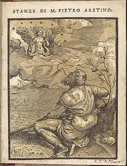 Pietro Aretino (US: /ˌɑːrɪˈtn, ˌær-/,[1][2] Italian: [ˈpjɛːtro areˈtiːno]; 19 or 20 April 1492[3] – 21 October 1556) was an Italian author, playwright, poet, satirist and blackmailer, who wielded influence on contemporary art and politics. He was one of the most influential writers of his time and an outspoken critic of the powerful.[4] He gained prominence through his politically charged writings and biting satire, which targeted powerful figures, including monarchs and popes. His works spanned various genres, including poetry, drama, and religious commentary, but he is particularly noted for his lampoons and erotic literature. Owing to his communications and sympathies with religious reformers, he is considered to have been a Nicodemite Protestant.[5][6][7][8]