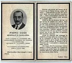 A career officer, Dodi had participated in the First World War as a cavalry captain in the "Cavalleggeri di Lucca" Regiment. Starting from 1921, he taught at the Cavalry Application School in Pinerolo; he later rose to the rank of brigadier general in the Army reserve.[1][2][3]