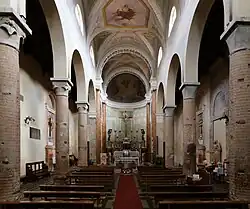 The main facade has sealed arches. The Romanesque bell-tower was rebuilt in 1885 by the architect Luigi Bellincioni. The interior is divided into three naves by 8 brick columns with Romanesque capitals and bases. The ceiling of the nave and of the apse are frescoed. On the left wall is a depiction of St Verano of Cavillon (1854) by Andrea Sorbi.