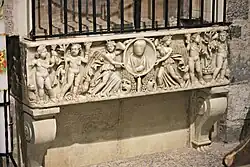 The layout is that of a Latin-cross and its façade is oriented to the west, while its semicircular apse to the east. The facade has a single portal added in 17th century. The rounded arch of a prior portal can still be seen. Above the portal is a statue of madonna and child, while in the upper register is a mullioned window. The stone bell-tower also has mullioned windows. A refurbishment of the church in 1938 restored the features as possible to the Romanesque origins. The mosaic floor consists of coloured marble geometric patterns. One item of note in the church is that an Ancient Roman sarcophagus (2nd or 3rd century) was reused to make the baptismal font. Bianco Bianchi (1464–1541), a chronicler from Camaiore, claimed that sarcophagi had originally contained the ashes of Lucio Imbricio, for whom Lombrici, where it was found, was subsequently named. The church also houses a fourteenth-century triptych by Battista from Pisa, depicting an Enthroned Madonna and Saints.[1]