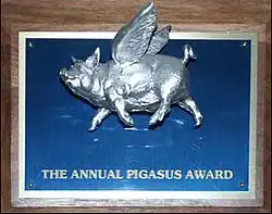 The Pigasus Award is the name of an annual tongue-in-cheek award, which was presented by the late James Randi, a skeptic. The purpose of the award was to expose parapsychological, paranormal, and psychic frauds whom Randi had noted over the previous year.[1] Randi usually made his announcements of the awards from the previous year on April 1 (April Fools' Day).