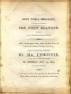 The Pigot Diamond, also sometimes called the Pigott Diamond,[1] the Lottery Diamond,[2] or the Great Lottery Diamond,[3] was a large diamond that originated in India in the 18th century and was brought to England where at the time it was the largest diamond in Europe. It remained in Europe for half a century, changing hands several times until it was sold to the ruler of Egypt in the 1820s. What happened to it after that is unknown, inspiring a two-century mystery.