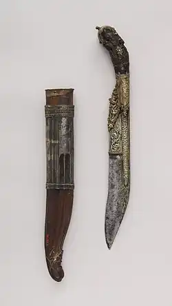 During the golden age of the Mughal Empire in India from the 16th to the early 18th century, dagger production and use was widespread. These daggers were notable for their high-quality metalwork, fine ornamentation and distinctive elegant forms. The graceful form found in many daggers and knives during the period indicates influence from the Islamic world. These daggers were often worn by princes and nobles for self-defence, for hunting, or for display. In combat, they were weapons for close-quarter combat, and some were capable of piercing the mail armour of Indian warriors.[1]