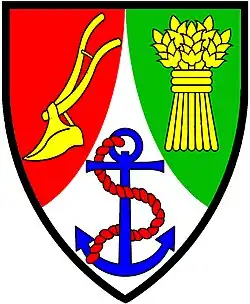 Lydney Rural District Council (abolished 1974): Argent, on a pile wavy throughout vert, a stag's head caboshed, between the attires a port between two towers, or; on a chief sable three crosses formy or. -