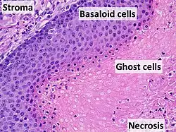 The characteristic components of a pilomatricoma include a stroma of fibrovascular connective tissue surrounding irregularly shaped, lobulated islands containing basaloid cells (being darkly stained, round or elongated, with indistinct cell borders and minimal cytoplasm, with nuclei being round to ovoid, deeply basophilic and generally prominent nucleoli), which abruptly or gradually transitions into ghost cells (having abundant, pale, eosinophilic cytoplasm, well defined cell borders and a central clear area, but only faint traces of nuclear material), which in turn may transition into keratinaceous to amorphous necrosis.[11]