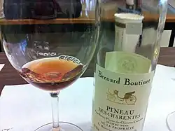 Pineau des Charentes (French pronunciation: [pino de ʃaʁɑ̃t] ⓘ; Pineau Charentais, or simply Pineau) is a regional aperitif of western France, made in the départements of Charente, Charente-Maritime, and (to a lesser extent) Dordogne. While popular within its region of production, it is less well known in other regions of France and somewhat uncommon abroad.