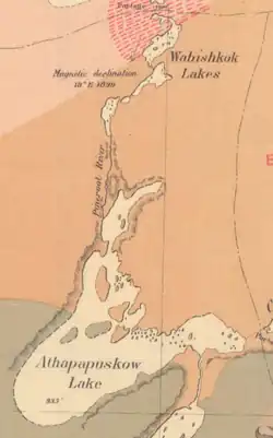 The river was a traditional route for Cree hunters. The first recorded European to travel it was Joseph Hansom, a Hudson's Bay Company fur trader who paddled inland from Churchill to Kississing Lake and down the Pineroot to Lake Athapapuskow.[4] Donaldson B. Dowling, working for the Geological Survey of Canada, was the first to survey the river in 1899.[5] Subsequently, in 1902, it first appeared on a map drafted by Joseph B. Tyrrell and Dowling, which accurately recorded both its route and name.[6] One of the earliest attempts at mining in the region was at the mouth of the Pineroot. In 1914 the Chica claim was staked there, and worked for several years without result.[7][8]