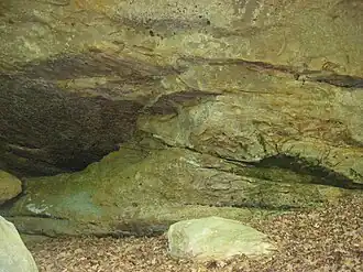 The Piney Creek West Site is a prehistoric rock art site located north of Piney Creek in Piney Creek Ravine State Natural Area in Randolph County, Illinois. The site consists of four petroglyphs painted on the inside of a rock shelter and a pictograph painted on the outside. The interior petroglyphs include an abstract shape, two curved lines, and a serpentine line with a pit at one end; two of the petroglyphs are filled in with ochre pigment, representing the only intact example of this painting technique in Illinois. The pictograph, which has deteriorated badly, depicts a human left hand; nearby flecks of paint from an unrecognizably faded figure likely indicate the site of the right hand. The paintings were likely added during the Late Woodland period, which lasted from 450 to 900 A.D. The serpentine figure inside the shelter suggests that the site had spiritual significance, as it resembles other prehistoric rock art depicting shamanic trance states.[2]