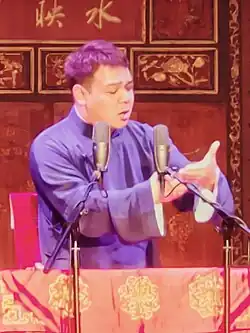 Pingshu performers often wear gowns and stand behind a table, with a folded fan and a gavel (serving as a prop to strike the table as a warning to the audience to be quiet or as a means of attracting attention in order to strengthen the effect of the performance, especially at the beginning or during intervals). They often add their own commentaries on the subjects and the characters in their storytelling. In this way, the audience, while watching their performances, is not only entertained, but also educated and enlightened. Travelers in Beijing will often find taxi drivers listening to it on the radio.[1]