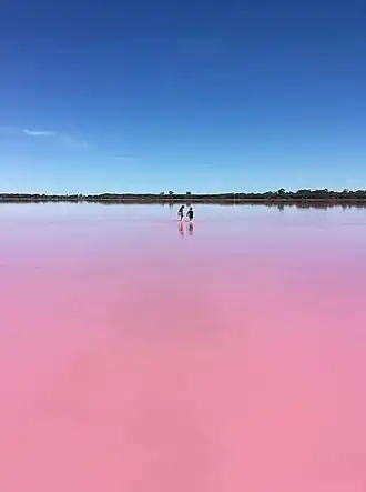 The lake received its name from its distinctive pink colour.[3] The brightness of the hue varies according to the level of rainfall.[4] Until recently it was assumed that red algae created the pink hue; however, recent research reported by Australian Geographic describes the colour as result of a pigment produced by the Salinibacter ruber bacteria.