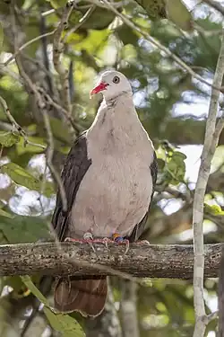 The pink pigeon (Nesoenas mayeri) is a species of pigeon in the family Columbidae endemic to Mauritius. The pink pigeon nearly became extinct in the 1970s and the 1990s and is still very rare. It is the only Mascarene pigeon that has not become extinct.[2][3] It was on the brink of extinction in 1991 when only 10 individuals remained, but its numbers have increased due to the efforts of the Durrell Wildlife Conservation Trust since 1977. While the population remains at below 500 birds as of 2011, the IUCN downlisted the species from Critically endangered to Endangered on the IUCN Red List in 2000, and then downlisted it again to Vulnerable in 2018.