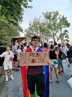 During the Gaza war, queer Palestinians argued that Pride and the Pride flag had been co-opted by pro-Israeli group to justify and celebrate much of the resulting Gaza humanitarian crisis.[32] Many queer pro-Palestinian activists advocated against the war, disrupting some Pride parades during 2024.[33]