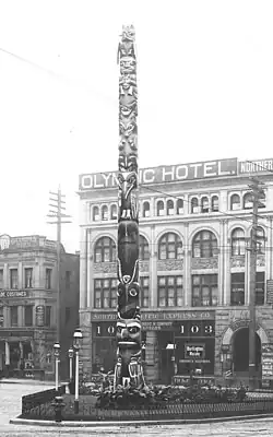 In March 1923, the totem pole was moved 25 feet (7.6 m) south to make room for a new sidewalk in Pioneer Place and the widening of First Avenue.[29] In 1958, Seattle's professional ice hockey team was renamed the Seattle Totems.[30]