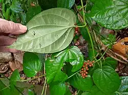 It is a perennial root climber with a stem diameter up to 2 cm (0.79 in). The leaves may be broadly or narrowly ovate to elliptic and can reach 18 cm (7.1 in) in length and 12 cm (4.7 in) in width. The inflorescence is a spike produced on the stem opposite a leaf; male spikes are up to 7 cm (2.8 in) long, female spikes to 18 cm (7.1 in). Flowers are minute, less than 1 mm (0.04 in) diameter. The fruit is, in botanical terminology, a berry about 6 mm (0.24 in) diameter containing a single seed.[3][4]