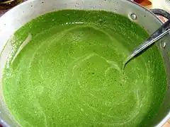 Pique verde is made from roasting ají caballero chilies, cubanelle peppers, garlic, onions, and blended with fresh parsley, cilantro, culantro, olive oil, and lime juice.[1]