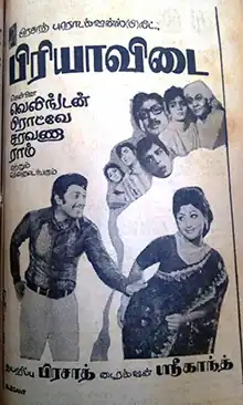 Piriya Vidai (transl. Farewell) is a 1975 Indian Tamil-language drama film directed by Srikanth and produced by L. V. Prasad.[1][2][3] Starring R. Muthuraman and Prameela, it is a remake of the 1970 Telugu film Thalla? Pellama?. The film was released on 15 August 1975 and failed commercially. The film had two song sequences filmed in colour.
