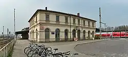 As part of the federal government's stimulus package,[5] the station building was redeveloped in 2009 and 2010 by DB Station&Service for around €1.5 million. The focus of activities was on saving energy through the renovation of the facade and the roof, which received insulating plaster over its whole surface. The old wooden windows and sandstone structure elements have been repaired to preserve their historic aspects. The undisputed highlight was the opening of the ceiling in the reception hall and the renovation of the skylight lying over it to restore the historical impression of a friendly, light-filled space.[6]