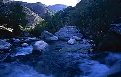 Below Pyramid Dam, Piru Creek maintains a relatively constant flow due to releases of reservoir water. It turns south and flows through the Topatopa Mountains via the Piru Gorge and along old route of Hwy 99−Pyramid Dam Road, forming the boundary between Mount Pinos and Saugus Ranger Districts of the Los Padres National Forest and dropping over Piru Creek Falls.[5][6][7]