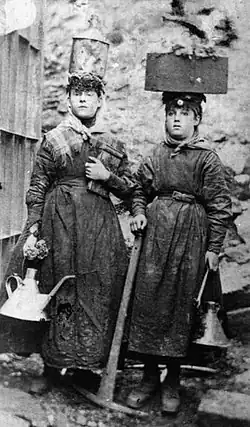 Not all women who had worked underground gained employment as surface workers. Lighter work on the surface had traditionally been reserved for older men and men who had been injured below ground and some colliery owners considered pits unsuitable places for women. Other colliery owners were happy to employ women who had proved themselves reliable and strong workers and were used to the language and habits of the miners.[10] Male surface workers earned twice the wages of the women who worked twelve-hour shifts, five days a week and a shorter shift on Saturdays.[8] Women surface workers were concentrated in Scotland, South Wales, Cumberland, Shropshire and South Staffordshire and Lancashire.[11]