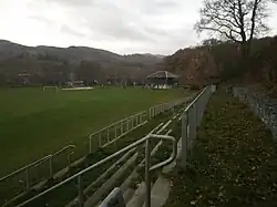 Pitlochry Recreation Park with spectator terracing and pavilion.