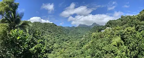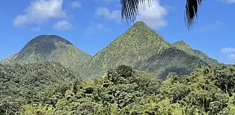 ![]() Pitons de Carbet as seen from the Route de la trace linking Fort de France to Morne Rouge. From right to left: Piton Lacroix, Piton Dumauzé and Piton de l'Alma. | |