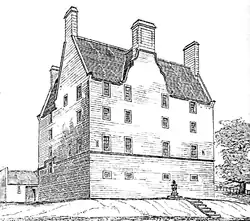 Wardlaw began to construct the house in 1615.[2] It was originally built to a U-shaped plan, with a symmetrical layout comprising a rectangular main body about 20 metres (66 ft) long, two short wings projecting to north, and spiral staircases rising up both interior angles.[3] The roof originally had crow steps on the gables and dormer windows, with the only entrance on the inner side of the west wing: a matching door in the east wing led down to a blind cellar. There were only small windows on the ground floor. Pitreavie is considered to be an important example of an early 17th-century symmetrically planned house, in the style of Sir James Murray, the King's Master of Works, and is similar to his Baberton House of the 1620s.[1] The grounds were planted as a wilderness in the late 17th century, with acres of ash, birch and elm trees.