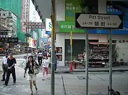 Pitt Street is a street in one of the busiest sections in Yau Ma Tei of Hong Kong. The street is named after William Pitt the Younger,[1][2][3][4][5] prime minister of the United Kingdom, and before Acts of Union 1800, of Great Britain. It hosts several prominent sites including Kwong Wah Hospital[6][7][8][9][10] and the headquarters of Chinese YMCA of Hong Kong.[11][10] Pitt Street spans across three thoroughfares, namely Ferry Street in the west, Waterloo Road in the east and Nathan Road in the middle, which connect the north and south of Kowloon Peninsula. While said to be in Yau Ma Tei, it could be in Mong Kok or Mong Kok Tsui, depending on context. Its name in Chinese character is 碧街, which the character 碧 /pik/, literally greenish jade,[12] is a phonetic approximation of Pitt in Cantonese and 街 a literal translation of street.[13]
