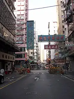 The street forms junctions with multiple streets, from west to east, Ferry Street, Tak Cheong Street, Tung On Street, Canton Road, Reclamation Street, Shanghai Street, Portland Street, Nathan Road, Yau Mong Lane, Tung Fong Street, and Waterloo Road. Historically, Shanghai Street was formerly known as Station Street (North/South) and Nathan Road as Coronation Road.[17] There used to be a junction with Kwong Wah Street, which was removed during the reconstruction of Kwong Wah Hospital around 1958.[18] The street, at the east end, extends beyond Waterloo Road to Chun Yi Lane, but the dual carriageway of Waterloo Road blocks the direct traffic between the street and the lane.