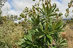 Pittosporum hosmeri is a small tree with height ranging from 10 to 25 feet (3 to 7.5 m).[5][6] Branches are typically smooth, but new growth is often covered in woolly brown hairs. Leaves are leathery and oblong, ranging in length of 3 to 10 inches (7.6 to 25 cm). Large white flower clusters can bloom throughout the year.[7]