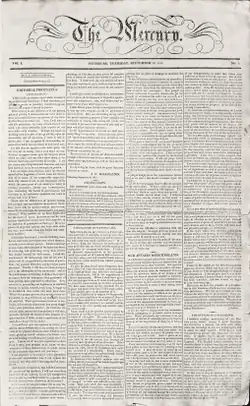 The Mercury began weekly publication on 26 September 1811, with James C. Gilleland as editor and proprietor.[2] Within a year it was purchased by John M. Snowden, who while at the helm of the paper attained prominent local political posts, including Mayor of Pittsburgh in 1825–1828.[2][3]