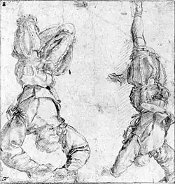 Famous artists who painted pittura infamante frescoes include Andrea del Castagno, Sandro Botticelli, and Andrea del Sarto.[10] There are no surviving examples of pittura infamante frescoes, but contemporary sources suggest that they were brightly colored.[2][7] Detailed descriptions of pitture infamanti in primary sources are rare.[11] A very few preparatory drawings, however, are extant, and The Hanged Man from Tarot cards is thought to resemble the archetypal pittura infamante theme, as Tarot decks were first produced in northern Italy in the 1440s.[4]