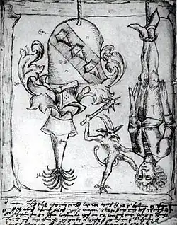 Common themes of pitture infamanti – which were meant to be humiliating – include depicting the subject as wearing a mitre, hanging upside down, or being in the presence of unclean animals such as pigs or donkeys or those deemed evil like snakes; pitture infamanti would also contain captions listing the offenses of the subject.[7] Pitture infamanti could originate as more favorable depictions, only to be transformed after the subject had fallen out of favor.[8]