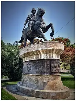 Pitu Guli is a national hero in North Macedonia and Bulgaria, and remembered as having fought heroically at Mečkin Kamen (Bear's Rock) near Kruševo, where he was killed during the Ilinden Uprising in defense of the Macedonian Kruševo Republic.[1] A Macedonian Partisan brigade was named after him.[1] The Macedonian partisan Kuzman Josifovski took the alias "Pitu" after him.[11] He is also celebrated in folk songs and poetry throughout the region of Macedonia, being mentioned in the national anthem of North Macedonia ("Denes nad Makedonija", "Today over Macedonia").[12] An Aromanian-language song about him, Cãnticlu al Pitu Guli ("The Song of Pitu Guli"), has also been composed.[13][14]